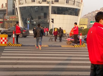 志愿者们劝阻闯红灯的行人