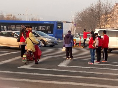 实践活动中,同学们亲身参与到道路交通指挥中,积极服务行人,帮助交警劝阻行人闯红灯过马路等违法行为,得到市民的认可。