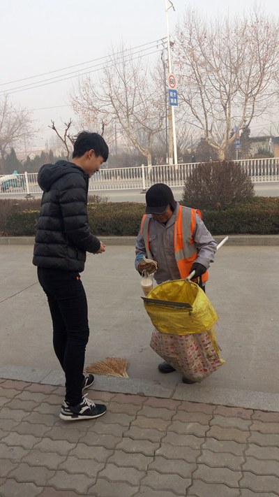2月15日,软件与服务外包学院志愿者们来到岔河沿岸街道开展“环保爱心行”志愿服务。 活动中,志愿者沿着岔河一路前行,清理街道卫生。一路上,志愿者不仅清理了纸屑等垃圾,还与路上的环卫工人进行了交谈。时值寒冷天气,志愿者们将准备好的手套、暖暖的豆浆送到环卫工人的手中,以表达他们的敬意。新春过后,环卫工人比任何职业工作者都要早到自己的岗位,他们的敬业精神让志愿者们深深钦佩。