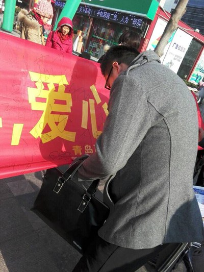 志愿者组织市民在横幅上签字
