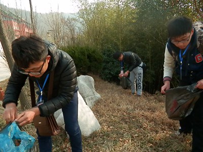 志愿者捡取景区绿化带垃圾