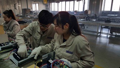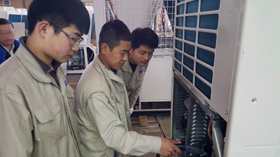 进入海尔集团后,同学们通过7天的企业培训,对企业文化、企业内部运转和班组建设等有了初步了解。随后,39位同学被分配到商用空调和中央空调工厂,与所在岗位的师傅签订师徒条约,主要负责生产线上空调零件加工和总装等工作。