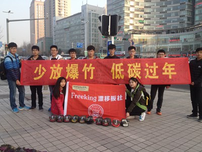 为号召市民保护环境,春节期间减少鞭炮燃放,低碳过春节,2月4日下午,Free King漂移板社团部分社员来到黄岛区家佳源门前开展“少放鞭炮,低碳过年”宣传活动。