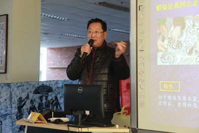 讲座中,王泽辉系统讲解了蜡染技术的历史沿革、蜡染的独有特征、民族特色及制作过程,并现场教授大家扎染技术当中的绑扎方法。随后,在王泽辉的指导下,学员们尝试了对绑扎好的作品进行染色,经过反复学习,最终掌握了扎染技巧。