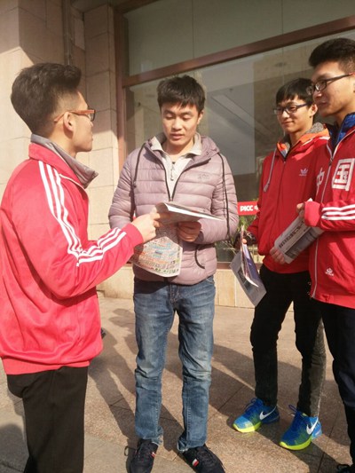 1月29日,知行书院2015级学生志愿者在开发区进行义卖报纸活动,并将卖报所筹集的善款捐给腾讯公益“壹基金温暖包”。
