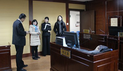 邢广陆代表学院希望黄岛区人民法院在安排案件旁听、参与法律大讲堂活动、指导模拟法庭建设、丰富法治宣传与教育形式、发挥教师人民陪审员作用、为学生提供冬、夏季学期法治实践机会等方面继续给予大力的支持。丁培增代表法院对我院提出需要支持和帮助的问题给予明确的答复,他还对依法解决学生纠纷、关注特殊群体的身心发展等问题提出了具体建议。邢广陆一行还参观了法院的审判庭。
