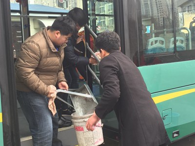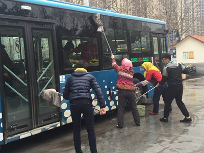 下午2:00,团支部全体同学集合完毕,拿着抹布、水桶、扫帚等卫生工具来到公交公司停车场,分为三个小组,依次对9路、15路、25路公交车进行卫生清理。同学们分工明确,在工作人员的帮助指导下,认真地清理车内地面,擦洗车玻璃和车身,高效、迅速地将进场的公交车打扫得焕然一新。同学们的表现得到车站工作人员的一致认可。
