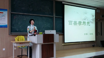讲座中,台琨首先根据目前社会上有些人过分追求“术”而忽略“道”的现象,指出 “德者本也,财者末也”,而立德之前先要行孝。随后,她从孝的反思、孝的感恩、孝的实践和孝的忏悔4个方面为在场的学生详细解读了“孝”。她认为,要更好地传承孝道文化,践行孝道,要做到“三步曲”,第一步是善养、孝顺、劝谏;第二步是孝敬、及时、祭祀;第三步是积德、修身,只有这样才能达到“孝”之境界。讲座过程中她引用了大量的古今视频案例、名言古句,晓之以理,动之以情,深深打动了在场的每一位同学。听完台琨老师的讲座,在场的同学全体起立向她鞠躬表示感谢。