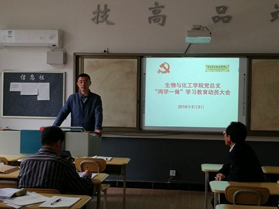 为进一步推动“两学一做” 学习教育活动的开展,按照党委组织部的要求,生物与化工学院党总支于5月5日下午在致用楼201召开“两学一做”学习教育动员大会,会议由党总支书记邵凯主持,生物与化工学院党总支全体教职工党员和部分学生党员参加了此次会议。