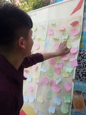 为了吸引更多的同学参加活动,社员们事先做了网络宣传、制作海报、租借音响等很多准备工作。下午两点,活动正式开始,前来写祝福语的同学络绎不绝,大家脸上都流露着幸福的笑容。活动持续了3个小时,大约200余位同学写下了自己对母亲的祝福。虽然每个人所写的内容不同,但对母亲的爱却是一样的珍贵。