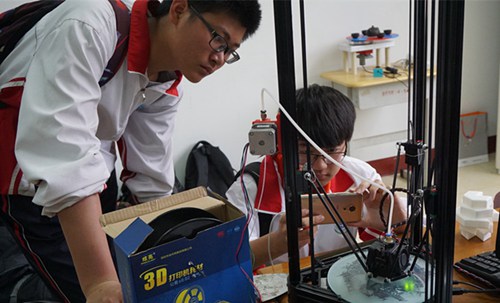学生观察机械CAD、CAM应用工作室自制Delta型3D打印