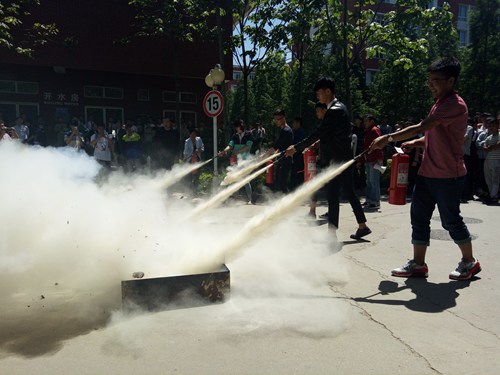 本次消防演练活动中,首先模拟每栋学生公寓4层最西侧学生宿舍失火,随着警报声响起,公寓管理员切断公寓电源,在浓烈的烟雾中,学生按照预定方案紧急疏散,5层、6层的学生紧急向学生公寓楼顶平台疏散,1至4层的学生紧急向学生公寓楼外广场疏散。疏散过程中同学们用毛巾捂住口鼻,快速有序地由各楼迅速撤离到指定地点集合。紧急疏散演练结束后,学生处副处长杨春旺进行了现场点评和总结;安保处的老师和学生消防社团还现场讲解、演示了灭火器的使用方法;辅导员和学生公寓自治委员会骨干进行了现场灭火演习。