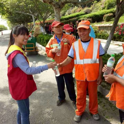 为了开展此次活动,小雨点社团提前做了充足的准备:购买了四提矿泉水,并精心制作了写有特色祝福语的贴纸贴在瓶上。早上8:30志愿者们在学校北门集合完毕,分两队沿香江路两侧为环卫工人送水。大家只要远远地看到环卫工人就会热情地跑过去问候一声“您辛苦了”并送上一瓶矿泉水,环卫工人在接到水后的那一声“谢谢”和他们脸上露出的笑容,是公益志愿者们最大的幸福。