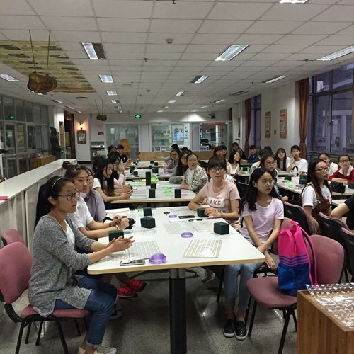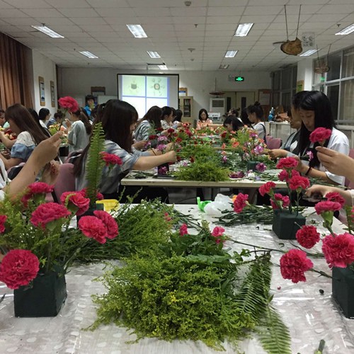 培训分为理论讲授、教师示范及学生实操3个部分。潘庆杰首先介绍了插花基本理论及中式西式插花特点,然后示范了西式插花中球型造型的步骤。接下来,同学们自己尝试动手插花。活动中,同学们浓厚的学习兴趣,认真的学习态度,高效的学习能力及老师幽默轻松的语言表达,严谨的教学态度,让插花课堂生动有趣。