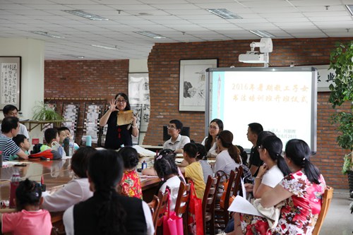 开班仪式上,刘朝晖介绍了戴氏书法的特点及教学规律,并现场展示多副精美的书法作品,引领学员感受戴氏书法的生命与魅力;孙钢代表学院工会对学员的到来表示欢迎,并预祝2016年暑期教工子女书法培训班取得圆满成功。
