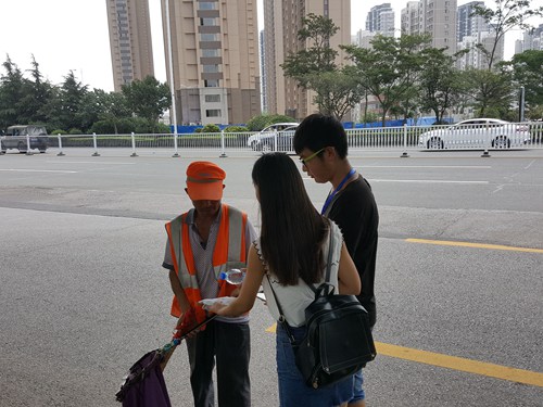 日前,“美丽乡村行”社会实践团队在学院周边开展“献爱心,送清凉”爱心志愿服务活动。此次活动主要为坚持在岗位上的环卫工人赠送矿泉水,感谢他们为保持城市环境卫生所做的贡献,使他们在炎炎夏日也能感到一丝“清凉爱心”。