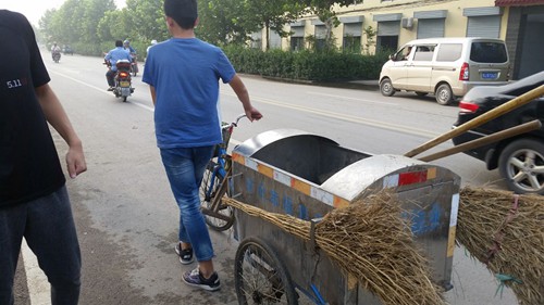 志愿者帮环卫工人推车