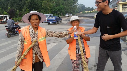志愿者给环卫工人送水
