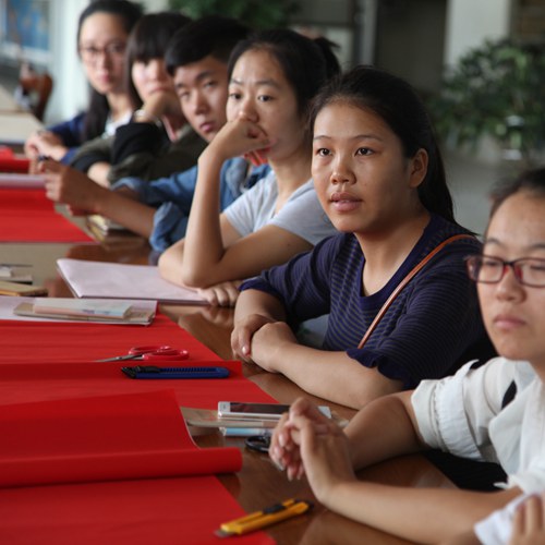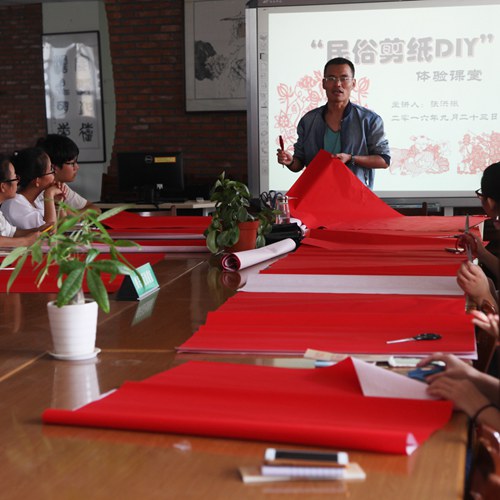 上午10点,“民俗剪纸DIY”体验课堂正式开始。艺术学院张洪振老师作为指导教师详细地讲解了中外剪纸差异、中国剪纸风格特征、创作方法等知识,同学们听得认真投入。讲解过程中,张洪振向现场同学展示了一系列精美的剪纸作品:麒麟瑞兽、花鸟福寿、龙凤呈祥、凤凰牡丹……剪纸艺术理论讲解结束后,有趣的动手实践开始了。张洪振示范剪纸技巧,展示了常见的剪纸纹理、对折剪纸、三六瓣折法、五瓣形折纸法等。同学们拿起红纸和剪刀,在老师的指导下,开始了一次次的练习。通过轻松快乐的学习,让学生近距离感受到剪纸文化的魅力,拉近了学生与传统文化的距离。“以前只是在报纸电视上欣赏别人的剪纸作品,今天的活动让我真实感受到了剪纸真的是一门博大精深的传统文化,值得我们去发扬光大。”参加活动的同学说。