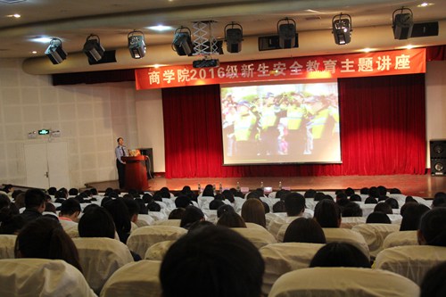 10月13日下午,商学院在艺术厅为刚步入大学校园的2016级新生举办了一次安全教育主题讲座。此次讲座邀请了青岛市公安局网警支队、青岛市公安局交警支队的4位民警向同学们讲解网络及交通安全知识。