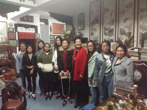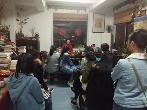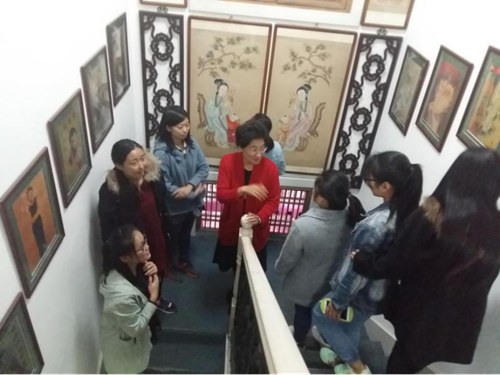 王艳带领学生参观竹安堂,详述各种文物的历史与文化传承。桌上的各式紫砂壶用来泡不同的茶,一盆很小的菖蒲竟已有5年的时间,楼梯上挂的美女图是民国时期的广告,墙上装裱的很多绣品是大名鼎鼎的苏绣,角落里的一尊石佛竟是明代的。容器中插着的干枯的草其实就是路边随处可见的野草……王艳说:“路边的野草,随处可见的四季花卉都可以点缀你的生活,关键是要有一双善于发现美的眼睛。”交流时,王艳提到读书、家教、苦难是人生的三大财富,善良、达观、信心是女性重要的品质,无论是待人,还是婚姻,都要尽可能地克己付出,内心才有光明。她尤其谈到女性在家庭和社会中的作用是至关重要的,一个好的女性可以让家庭幸福三代,所以一定要坚持读书,修身养性。