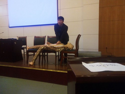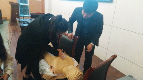 刘显波结合多年的临床经验,通过典型案例和模拟人现场模拟等方式,详细讲解了心肺复苏的基本知识、气道梗阻的急救、创伤救护、意外伤害的救护等医疗常识,他幽默生动、深入浅出的讲解,让师生们在轻松的氛围里,了解掌握了基本应急救护和紧急避险的基本知识和技能。