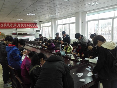 活动中,在社区活动室里,志愿者们向社区老人们讲解此次手工制作的具体流程和制作要点。随后,志愿者们通过“一对一”与社区老人们一起合作,用手中的扑克牌制作便携式小纸盒等手工,活动现场讨论热烈,气氛融洽。此外,志愿者们还与老人们交流谈心。