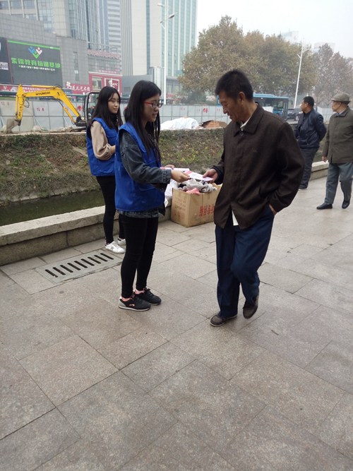 志愿者为路人发放公益宣传册