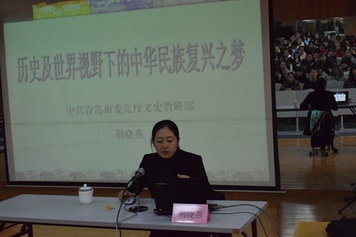11月24日下午,教育学院在比邻楼阶梯教室举办“历史及世界视野下的中华民族复兴之梦”主题讲座,讲座邀请青岛市委党校文史教研部副教授荆晓燕担任主讲人。教育学院辅导员、学生入党积极分子和2016级部分学生代表参加了讲座。