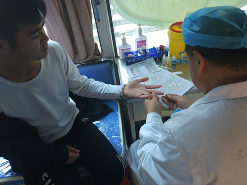 工作人员为献血者检验血型