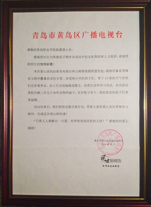 12月23日,黄岛区广播电视台向崧霖爱心社送来感谢信,感谢崧霖爱心社在“为青海孩子捐冬衣”活动中的大力帮助和付出。