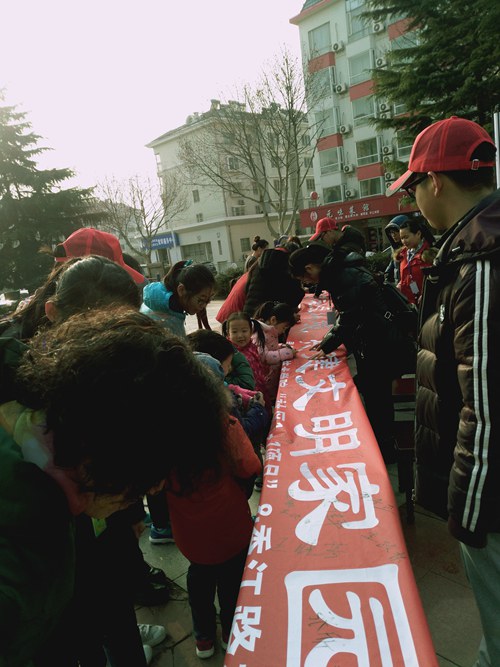 幼儿园小朋友在横幅上签字