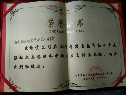 会上,我院艺术学院被评为2015至2016年度青岛市红十字无偿献血志愿服务爱心企(事)业单位。近年来,艺术学院志愿者协会采用社会化运作模式,与市区多个公益组织形成长期稳定的合作关系,广泛开展各类公益活动,其中,“点滴热血,浓浓真情”无偿献血志愿服务为常规性活动,自2016年3月份开展以来,参与人数达350余人,累积志愿服务时常900余小时,受益人数7500余人,产生了良好的社会效应,获得了社会各界的一致好评。今后,艺术学院将以此荣誉为新起点,为青岛市无偿献血事业做出新的贡献。
