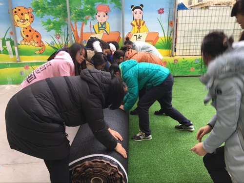 此次实践活动以体力劳动方式展开。在幼儿园老师的陪同下,志愿者们首先清洁整理了幼儿园空地、协助铺上供孩子们玩耍的装饰草坪,随后分组前往各班与孩子们面对面交流互动。活动中,志愿者们精心筹备的节目与互动活动博得孩子们的开怀大笑,使孩子们积极地参与到活动中来。