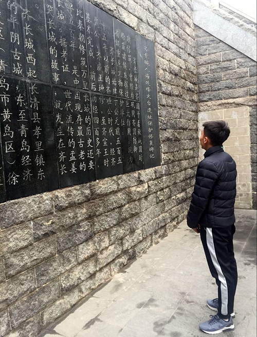 同学认真观看齐长城烽火台碑记