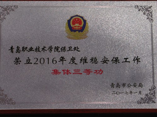 近日,因安保处2016年度维稳工作成效显著,被青岛市公安局记集体三等功,安保处综合办主任袁凯庆被记个人三等功,队员邱国亮被青岛市公安局给予个人嘉奖。