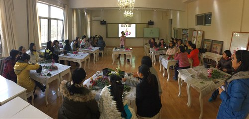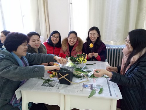 活动中,女教师们按专业部分成10组,边听讲座边练习插花。尹彦丽一边讲解不同鲜花剪枝的长短、不同花种摆放顺序、花泥浸泡的方法等,一边指导各组老师进行实际操作。