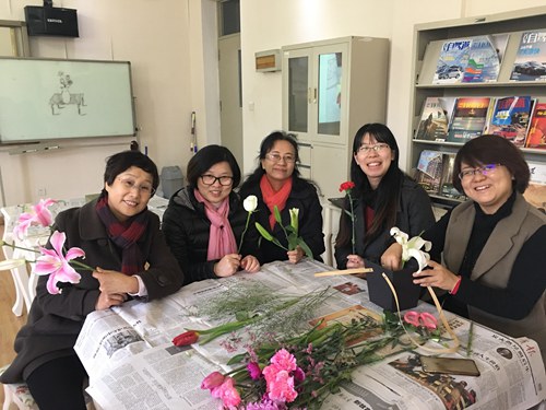老师们学习热情高涨,积极参与,小组成员之间配合默契,分工明确。老师们边学习插花,边交流工作,现场充满节日气氛。插花艺术讲座结束后,老师们将自己小组插好的花用来装扮办公室。