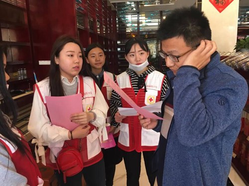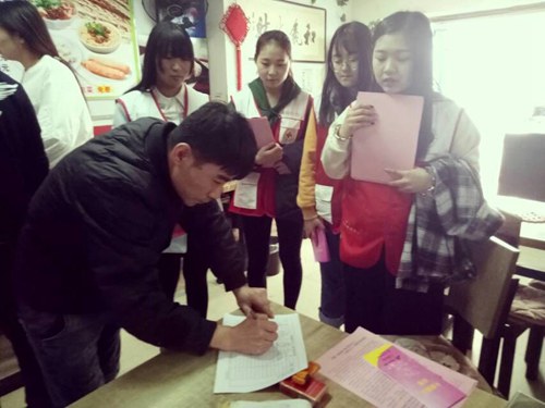 活动前,艺术学院学生工作负责人赵静向参加活动的志愿者代表讲解了志愿者应如何开展“一学一做”主题教育实践活动。她要求全体志愿者认真落实《通知》要求,进一步弘扬“奉献、友爱、互助、进步”的志愿精神,将教育实践与开展志愿服务、公益行动结合起来,向社会传递青春正能量。随后,志愿者们前往长江利群购物广场附近,参加团区委开展的“关爱环卫工人,共建爱心驿站”大型公益宣传活动,进入沿街商家店铺,发放《关爱环卫工人》倡议书,向市民耐心宣传此次活动的意义,呼吁有条件的沿街商家、单位敞开大门,请环卫工人进来歇歇脚、喝喝水。在志愿者的耐心讲解下,各商家店铺积极响应,现场签约近50家。