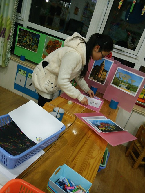 活动中,学生们展智慧,齐动手,利用近一周的时间,在幼儿园教师的指导下对12个班活动室和走廊进行了精心设计与布置,使幼儿园的室内外教育环境焕然一新。