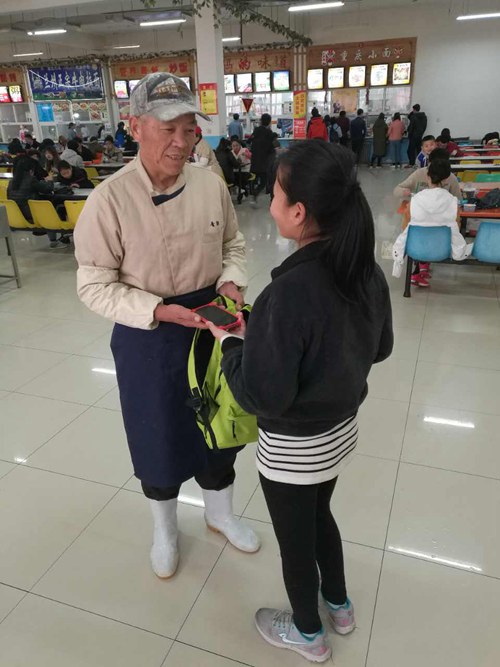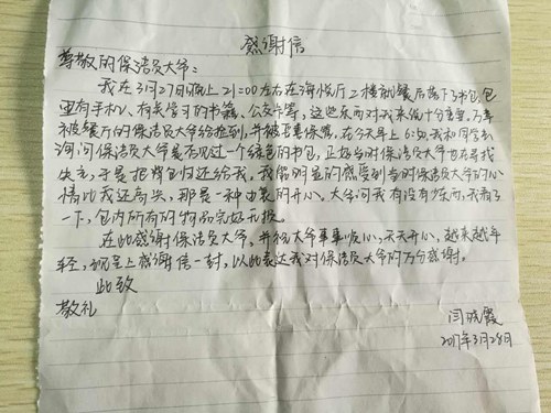 “把背包归还给我时,我能明显感受到当时保洁员大爷的心情比我还高兴,那是一种由衷的开心。保洁员大爷问我有没有少东西,我看了一下,包内所有的物品完好无损……”这是海尔学院学生闫晓霞写给食堂保洁员感谢信中的一段话。