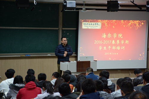 为增强学生干部的综合素质,提高学生干部的执行力,春季学期开学以来,海尔学院利用每周一晚上学生干部例会时间开展春季学期学生干部系列培训。海尔学院院长张明耀、党总支书记费晓玉、副院长张云龙、党总支副书记潘乐,图书馆副馆长丁洪霞、海尔学院就业工作负责人贾春刚等分别为海尔学院学生干部开展专题培训。