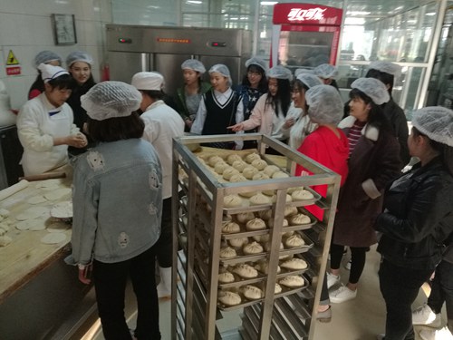 学生在食堂后厨面食间观摩”青职大包“加工制作过程