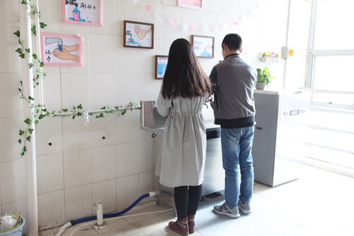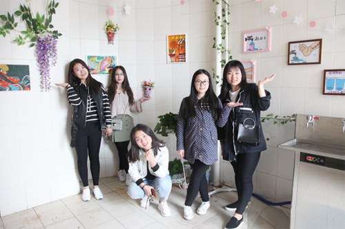 开水间的布置是由教育学院品牌班级志愿服务团队——2016级学前教育专业的王凯敏、杨佳琪等几位同学,利用劳动周时间精心完成的。从创意设计到完美收官,他们整整花费了5天时间,除了绿植花卉,其它的全是纯手工制作。如墙上极具视觉魅力的黑白圆盘画是用马克笔在纸盘上一笔笔绘出的,温馨的节水动漫标语,彩色装饰画及装饰边框,无一不是专业绘画与精巧手工的完美结合。