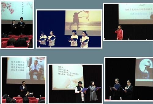 诗歌朗诵会以《你是人间四月天》作为开场,把现场带入到一个富有诗意的世界。之后,《面朝大海 春暖花开》《蒲公英》《致大自然》描摹了人与自然的和谐,《你是坠落凡间的精灵》《人生若只如初见》抒写了爱情的美好,《致橡树》《当你老了》《我相信》等作品展现了对人生的思考,《祖国啊,我亲爱的祖国》《回家的感觉真好》表达了学子们对家、国的热爱。香江路二小的张子涵同学作为特邀嘉宾朗诵了《诗经•蒹葭》,以稚嫩的童声演绎了千年经典的韵味。