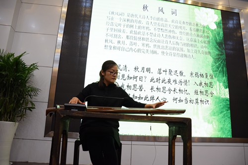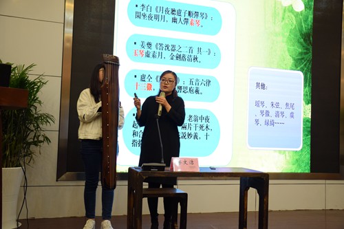 讲座开始前,李文洁为现场观众演奏了一首乐曲,将大家带入了古琴的世界。讲座采取讲解、演奏、演奏与吟唱、现场互动交流等方式进行,李文洁就古琴的发展历史、古琴的结构、古琴与自然的关系、古琴与诗词、琴谱、古琴被列入世界非物质文化遗产、几把名古琴的流失等知识进行了详细讲解。讲座期间,她演奏了乐曲《秋风词》,还一边演奏一边吟唱了乐曲《湘妃怨》。此次讲座激发了师生对古琴的兴趣,让大家掌握了古琴的基本知识。