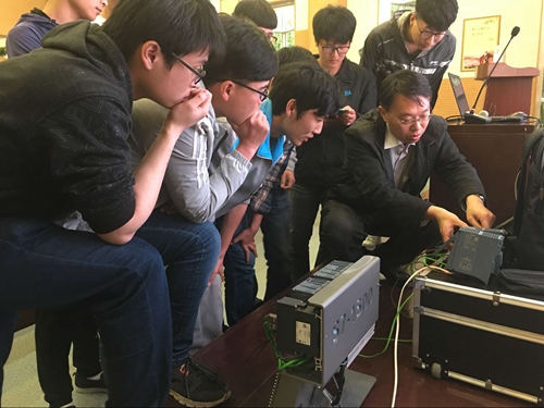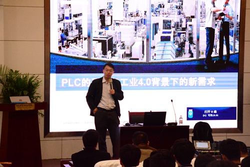 讲座中,王新宇介绍了西门子在中国的发展历程和应用领域,通过视频展示了数字化制造,以及PLC的历史与现状,分析了工业4.0背景下PLC发展的新需求,同时介绍了西门子公司PLC产品的发展史及分类、性能、优势等,并现场演示了先进的S7-1500 PLC设备的设置及操作。在讲座的最后环节,王新宇与同学们进行了互动交流,针对同学们提出的问题一一进行了解答。