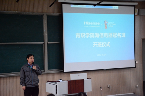 5月4日,学院“海信电器冠名班”开班仪式在修能楼举行。青岛海信电器股份有限公司人力资源部部长白东方、人事主管李代强,学院招生就业处处长赵悦、海尔学院院长张明耀、信息学院党总支副书记白杭及“海信班”全体学员参加开班仪式。仪式由海尔学院党总支副书记潘乐主持。