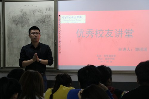 5月9日晚,作为学院职业教育活动周系列活动之一,由学院校友会主办,旅游学院校友分会承办的“优秀校友讲堂”活动在闻道楼举行,学院近百名学生参加。2013届酒店管理专业毕业生、青岛威斯汀酒店客房部副经理邹瑶瑶受邀来院担任“校友讲堂”主讲人,分享职业成长心得。
