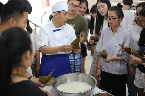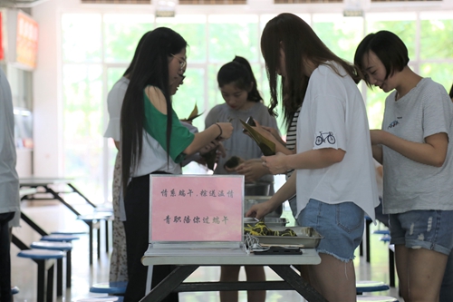 活动中,食堂从业人员将原先准备好的糯米、粽叶、蜜枣、红豆、香菇鸡肉等原料摆放好,随后厨师长向同学们示范如何包粽子,在厨师长言传身教的指导下,大家一起动手,边包边聊,只见一个一个捆扎得整整齐齐的粽子很快展现在大家面前,不知不觉150只有棱有角的粽子就包好了。当煮熟后的粽子和鸡蛋摆上桌时,学生们纷纷拿出手机拍照,发给远方的家人,送上一份浓浓的端午节问候与祝福。